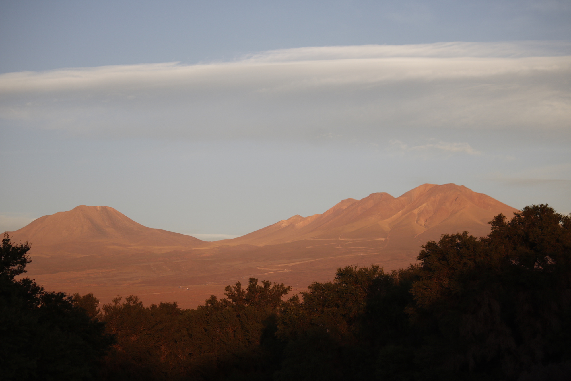 Gegen Abend begann ein wunderschönes Farbenspiel. Die Berge wurden von der untergehenden Sonne angestrahlt und boten uns ein unvergessliches Bild. Hier in der Atacama Wüste ist nicht der Sonnenuntergang selber so spektakulär, sondern die gegenüber liegende Seite. Hier werden nämlich die Anden angestrahlt und die Berge erscheinen zusammen mit dem Himmel in wunderschönen Farben.